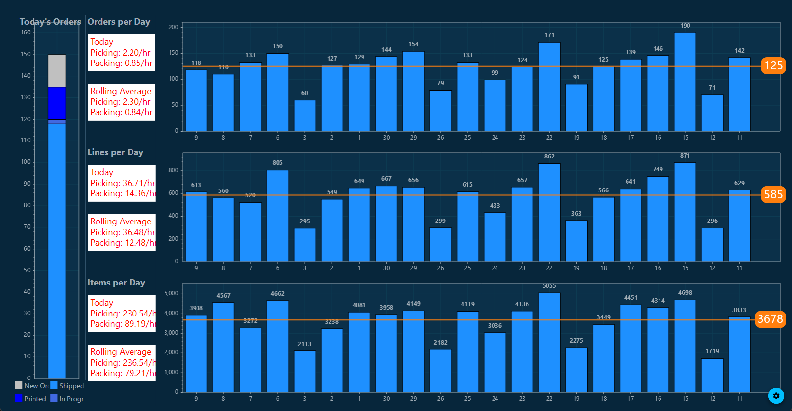 A graphical warehouse metrics dashboard, showing phase progression through Ready, Picking, Packing, Shipping and Shipped